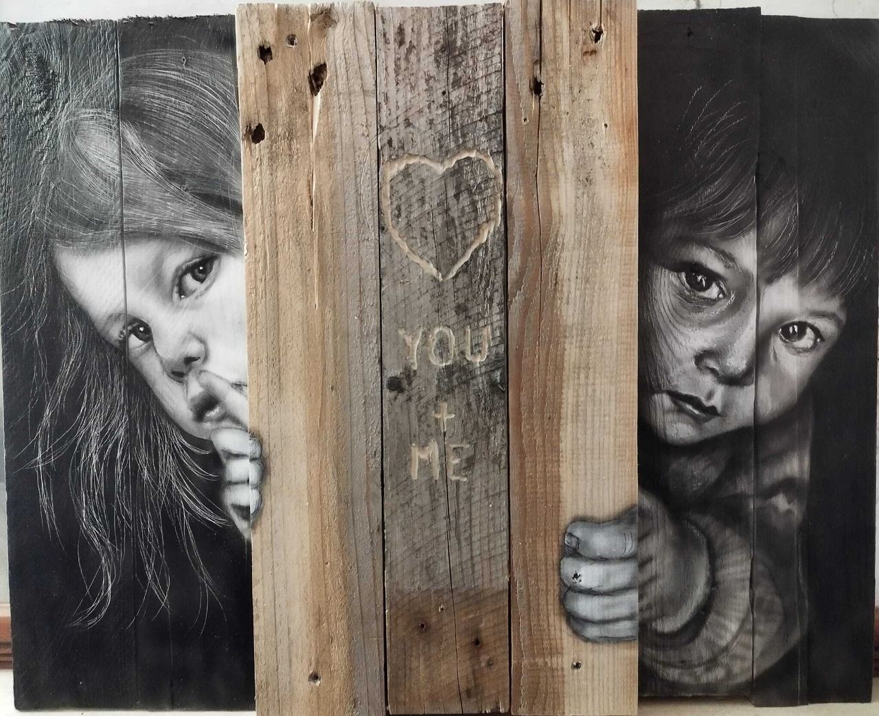 Une œuvre d'art triptyque en noir et blanc représente deux enfants, une fille et un garçon, regardant timidement de chaque côté d'une planche de bois sur laquelle est gravé « You + Me » et un cœur.